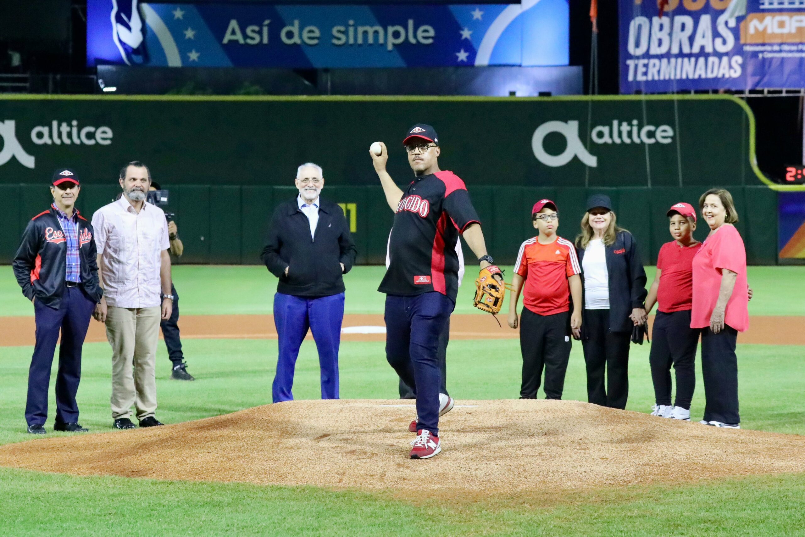 En el homenaje previo al encuentro contra los Toros del Este, José Daniel Calzada Grullón, su hijo, lanzó la primera bola acompañado de su madre Dennis Calzada y otros miembros de la familia.