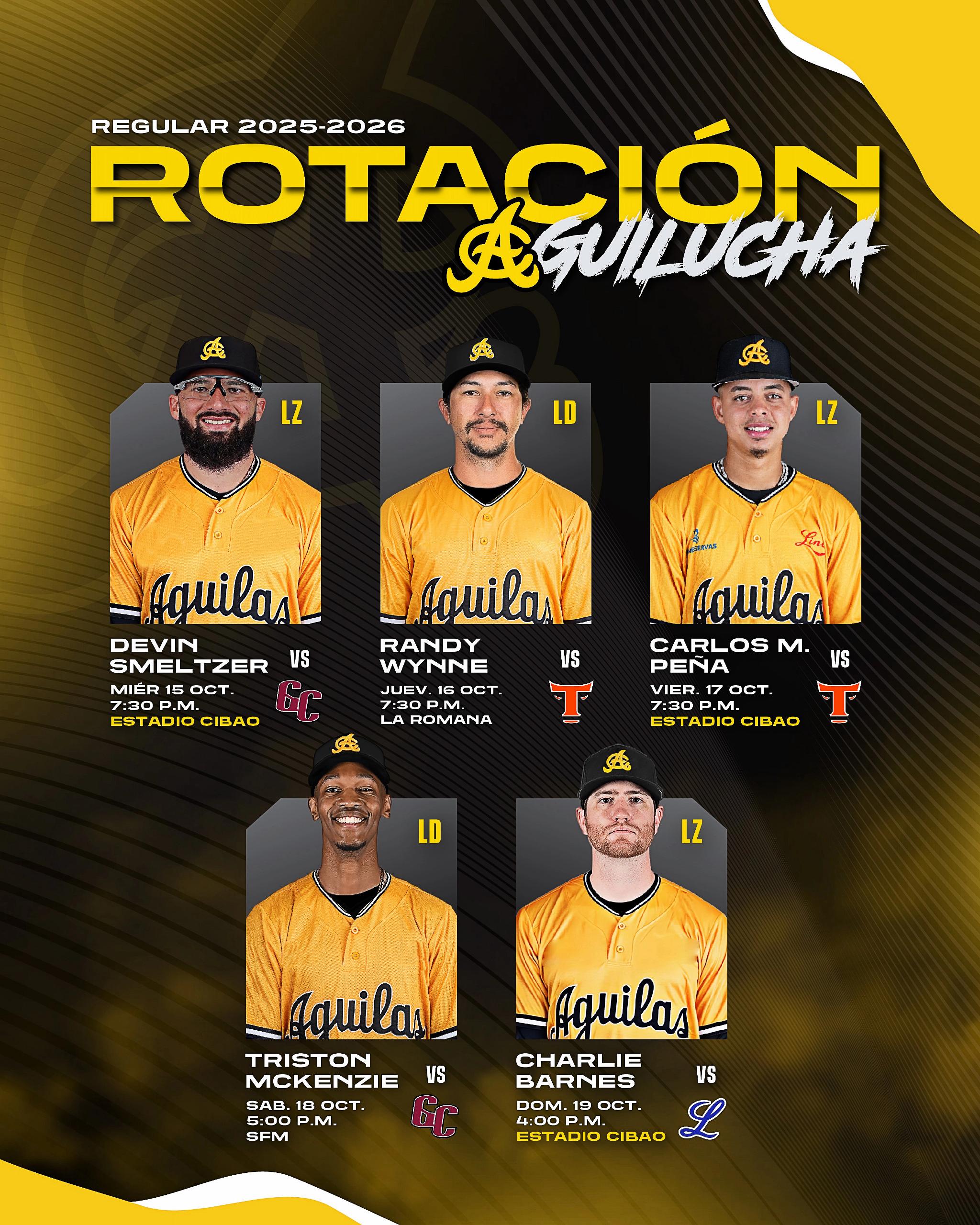 La rotación la completa el zurdo norteamericano Charlie Barnes, quien enfrentará a los Tigres del Licey en el Estadio Cibao el domingo 19.
